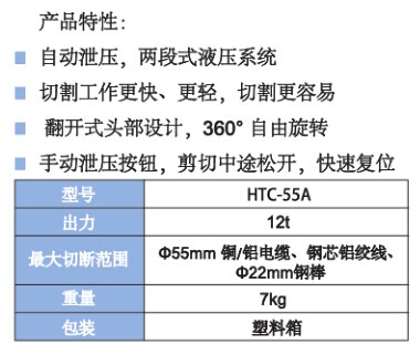 最大切断范围:Φ55 铜/铝电缆、钢芯铝绞线、Φ22mm钢棒