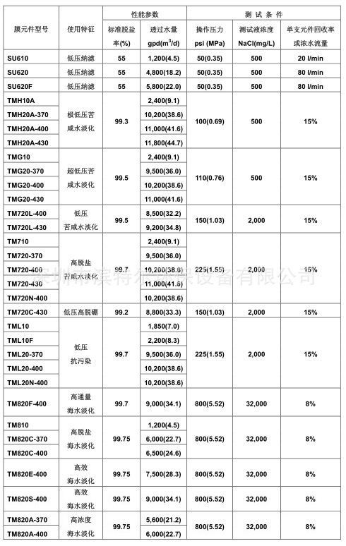 4、日本东丽反渗透膜/纳滤膜产品一览表