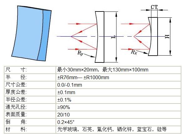 复曲面镜又称轮胎镜,在x方向和y方向上有两个曲率,对两个方向分别整形,多用于光线的大角度反射,反射后没有普通平面反射镜、球面反射镜的图像变形问题,减少了光学镜片的使用量,一片复曲面反射镜可以代替多片平面反射镜、球面反射镜和柱面镜的组合,减小了仪器的体积,使仪器调试更加方便简单,提高了仪器的质量。还可以透射使用,用于分别对x,y两个方向光束的整形。博信提供多种材质的复曲面镜,包括H-K9L、紫外熔融石英等。