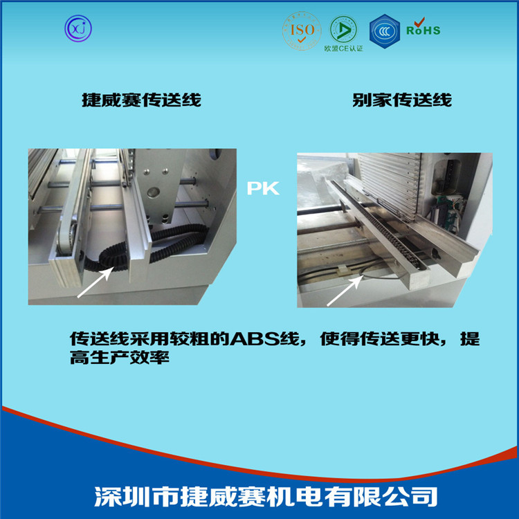 深圳市捷威赛机电有限公司成立于2003年,是一家集研发 设计 生产 和销售于一体的上板机、SMT周边设备的专业厂家之一,公司一直以来都致力于SMT周边设备的研发和生产,公司立足于长远发展,建立一套完整的生产管理,售后服务,质量管理,信息管理等综合管理体系.以提高生产力为使命,降低人工成本和实现自动化为基准,贯穿了华研科技的生产和销售,捷威赛科技创业伊始就秉承着实事求是,脚踏实地的经营作风。在发展的各个阶段一直保持着与市场需求紧密的配合,华研科技的市场品牌定位,人才界定标准和企业的发展战略始终和时代并进。