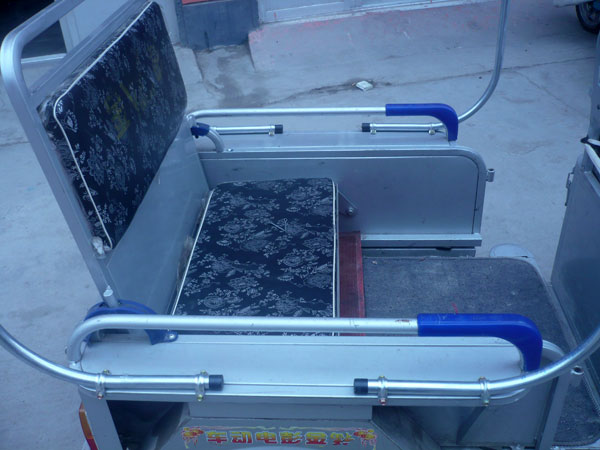 3、架子采用圆管,中间用镙丝紧固,可直接用箍卡固定在车上。因是双管,所以坚固耐晃,可用多年。前面挡风帘可自行摘下,