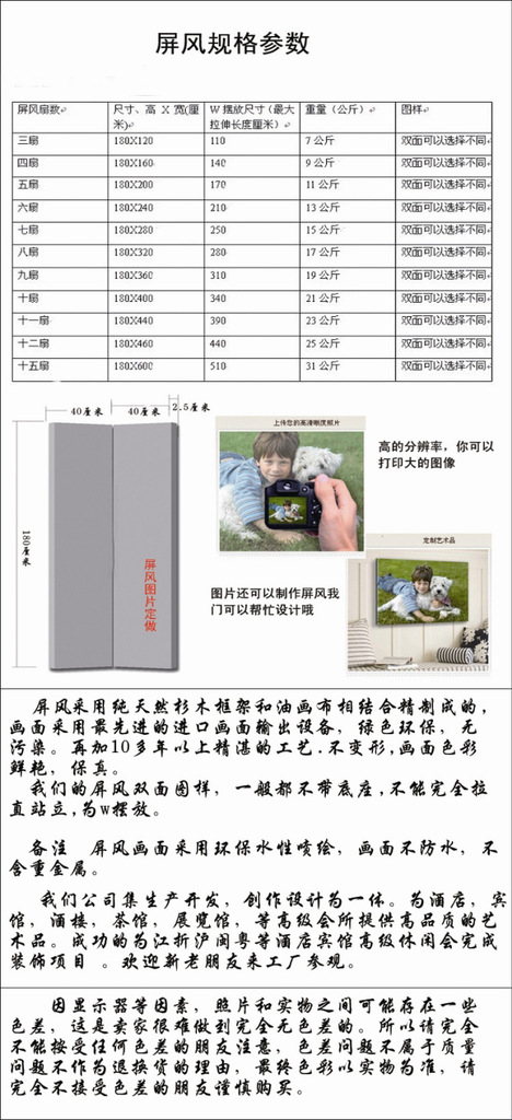 1 双面屏风采用专业油画颜料和油画布为原料(2.5CMX1.5CM或其它客户指定规格均可)纯杉木内框与油画布相结合制作而成,画面是进口喷绘机喷绘而成,绿色环保、防水不褪色、色泽清晰艳丽,做工精细,品量优良,玄关装饰、居家必备,可以按客人提供的图案定做