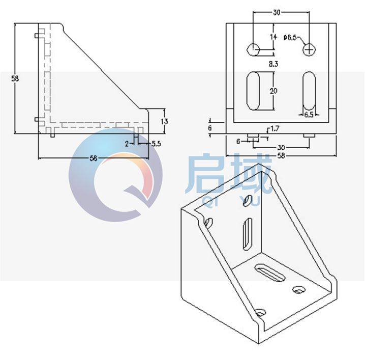 适用型材:6060欧标、国标双槽型材。用于两型材直角连接,可以用做需移动位置的型材连接,简单方便,连接时用的螺栓和螺母需另配。欧标型材通常用对应系列的30-M6*16T型螺栓+M6法兰螺母或30-M6T型螺母+M6*16内六角螺栓使用,欧标型材也可用T型螺母配内六角螺栓或内六角螺栓配滑块螺母、弹性螺母使用。国标型材还可用四方螺母与内六角螺栓配合使用。