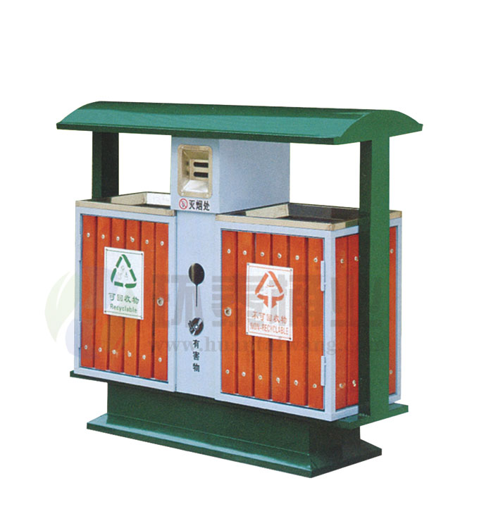 钢木垃圾桶HT-GM6920,该产品整体采用优质的镀锌钢板,防腐木生产加工而成,产品颜色为:浅绿,规格为长1040mm宽400mm高1000mm,本款新款街道钢木分类垃圾制造工艺采用:1、钢木垃圾桶桶身采用优质进口防腐木、进口山樟木或水曲柳制作,先经过烘干脱水、压刨、打磨、倒角、防腐处理后表面喷涂进口抗紫外线聚脂漆等工序,再经高温喷塑处理,可抑制微生物的寄生、繁殖与蛀蚀,具有防水、防霉等保护功效,能够抑制霉菌和藻类生物的生长,可有效减少紫外线导致的褪色,延长木材在户外环境中的使用寿命.客户也可以采用塑木代替实木.2、钢木垃圾箱采用镀锌钢板材质制作,钢结构均经过酸洗、磷化表面处理,然后再使用高温喷塑工艺,使垃圾桶更加经久耐用,防腐、防锈,美观大方.3、钢木果皮箱采用内部膨胀螺栓固定的方式,不易推到,不易被偷盗,使垃圾桶更加安全牢实.隐形固定还可以防止撞伤行人.