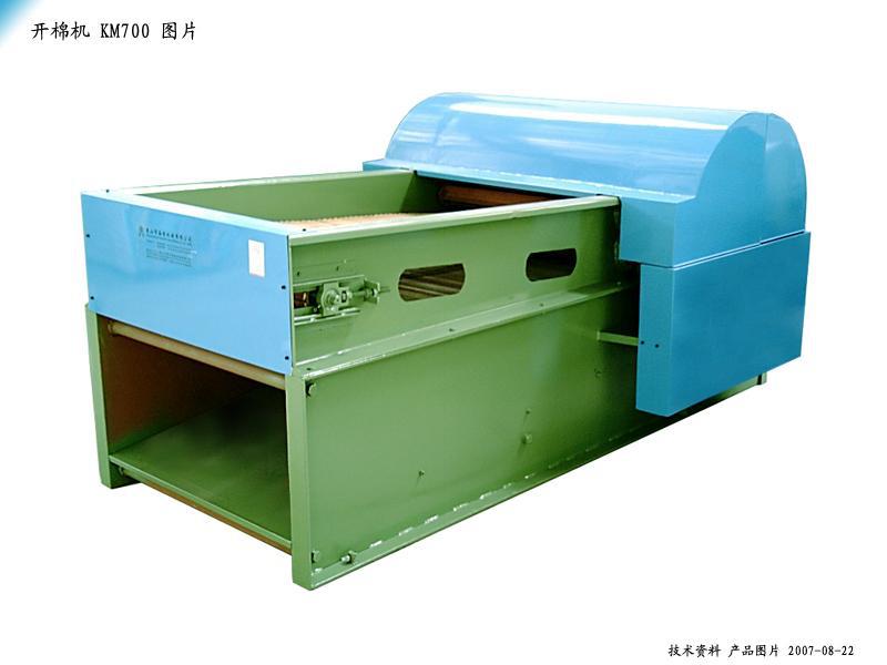 开棉机,又名开松机。本公司在引进韩国技术基础上,借鉴台湾以及同类产品优点,自主研制的新一代HJKM-PP型开棉机。目前是国内外市场最先进、体积最小,外观最大方、功效最强的产品,比同类产品每小时多松开15%-20%。特点:整机采用全封闭式,外观整齐美观大方适用操作安全可靠,吊运安装方便。利用锟筒针布逆方向运转产生的拉力对PP棉和棉花进行开松。是生产玩具,靠垫,沙发,床上用品厂家的理想设备。