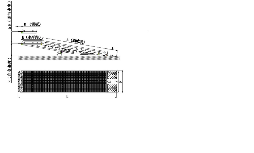 型号(model) | 额定载荷(KG) | A m | B m | C m | D m | E m | F m | H m | ΔH m | L m | 是否带支腿 | |