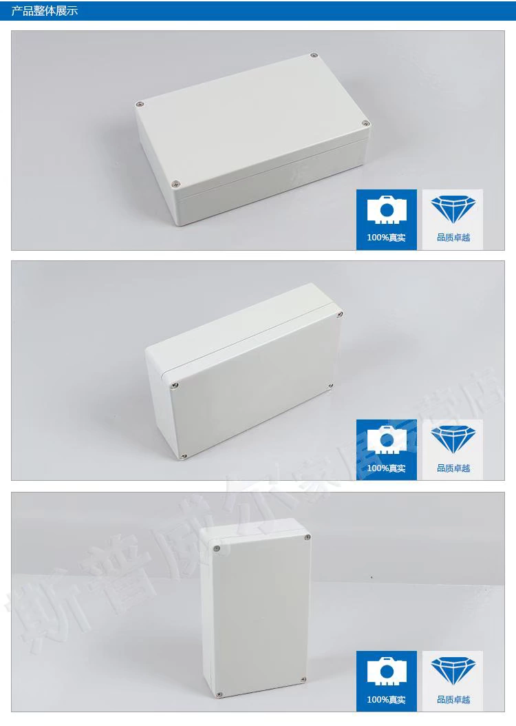 防水接线盒 分线箱主要适用于室内、室外电气、通信、消防设备、钢铁冶炼, 石 油化工,电 子、电力,铁路,建筑工地,矿山,采矿场,机场,宾馆,船舶、大型工厂、 沿海工厂、卸货码头设备 、污废水处理设施、环境公害设施等。 2.材质: 选用台湾进口的新料,优质的热塑性塑料ABS或(PC)聚碳酸酯,或者可以按客户的要求来先 择材料,可订做阻燃料,防紫外线材料,上盖有透明与不透明两种形式(材料 无腐蚀性,防静电,绝缘性 佳) 3.箱体厚度: 盒体最薄处平均厚度3mm,重要部位厚度加强(不会变形),冲击强度IK07(压不碎) ;阻 燃等级V0.(耐高度烤,长时间使用不退色),轻便(按装方便,可随意移动) 4.防水性能: 超强防水,防护等级达到IP66以上,即使在作业的时候下起大雨也是不会进水的,非常安全 。 5.认证: 产品通过CE认证,材料可以做(环保、阻燃,UL材料等认证),防水等级IP66认证检测通过。 6.按装方式: 1.内部按装—盒子内部有供线路板或DIN轨道元件安装的凸台,及自带的铜接线螺母(每只 防水盒内部都配有最少二个以上的很常规的M4的铜螺母)2.外部按装--可通过盒体低部的安装孔直接固定 于墙面(可通过盒子的四个角,直接用螺丝或钉子固定在墙上或板子上) 7.进出线孔: 防水盒可以随意跟据客户的使用要求在上面开孔,(开孔位置及开孔大小都可以按照客户指 定要求加工。)开孔后可以装有配套的防水夹紧接头,达到防水最佳效果。 8.使用寿命: 防水盒的使用寿命常规的材料跟据使用环境不同一般会在5年左右,如果材料有添加阻燃剂和防老化剂[ 抗氧化剂寿命可达到10年以上。热变形温度:-40~~85度。 同类产品有很多规格尺寸,请来电资询,或留言
