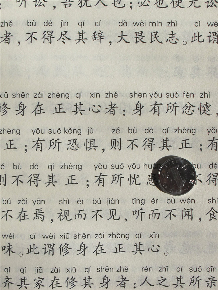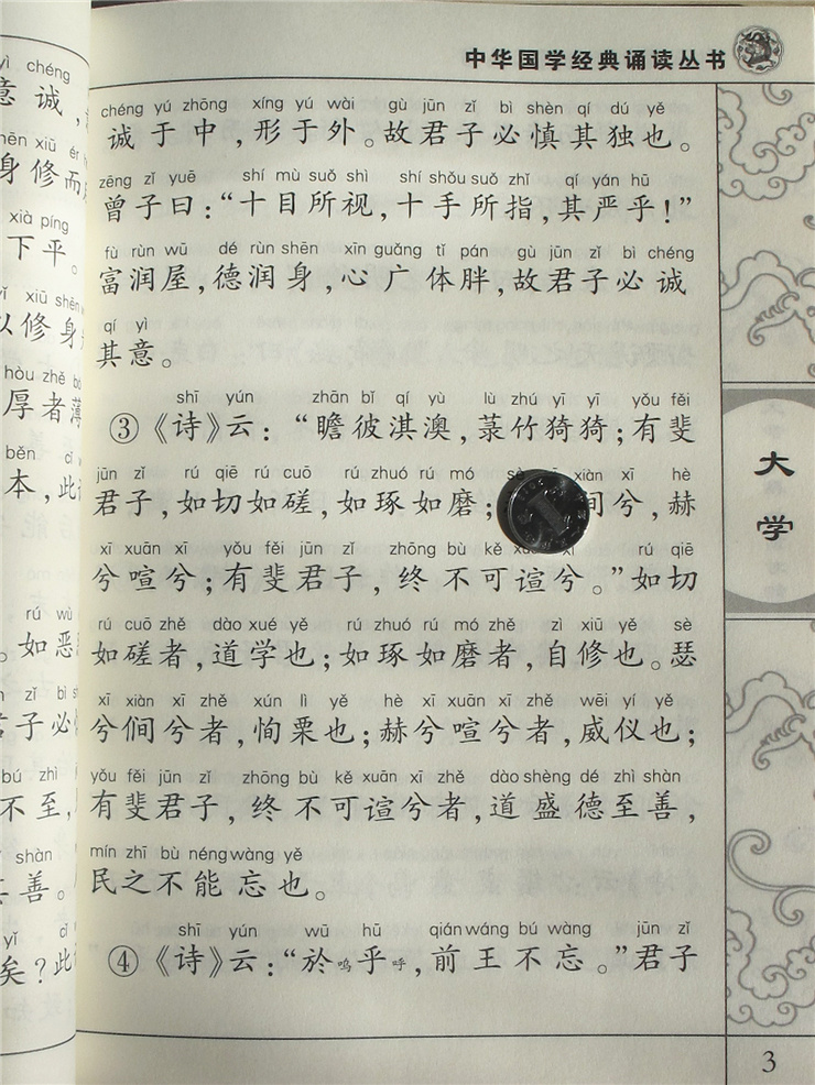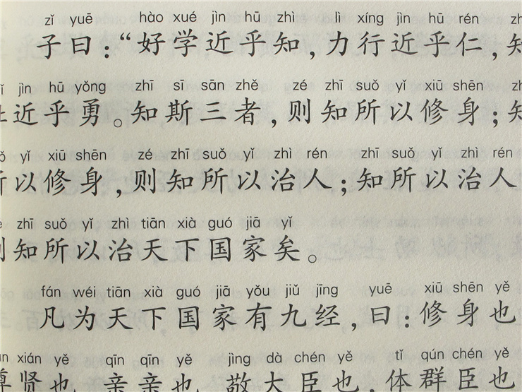 此套书“大字”“大拼音”、“白文”--无插图、无注解。“大字”是为了节省目力,以保护儿童的视力,不仅适合儿童读诵,更方便一般成人读诵。“白文”而无解释,是因“读经”不同于一般的知识学习,其重点在于多接触、熟习,只要多读,自有浸润,自有感发,自有理解。儿童时期的教育模式,当以读诵薰习为主,讲解并非迫切之事。