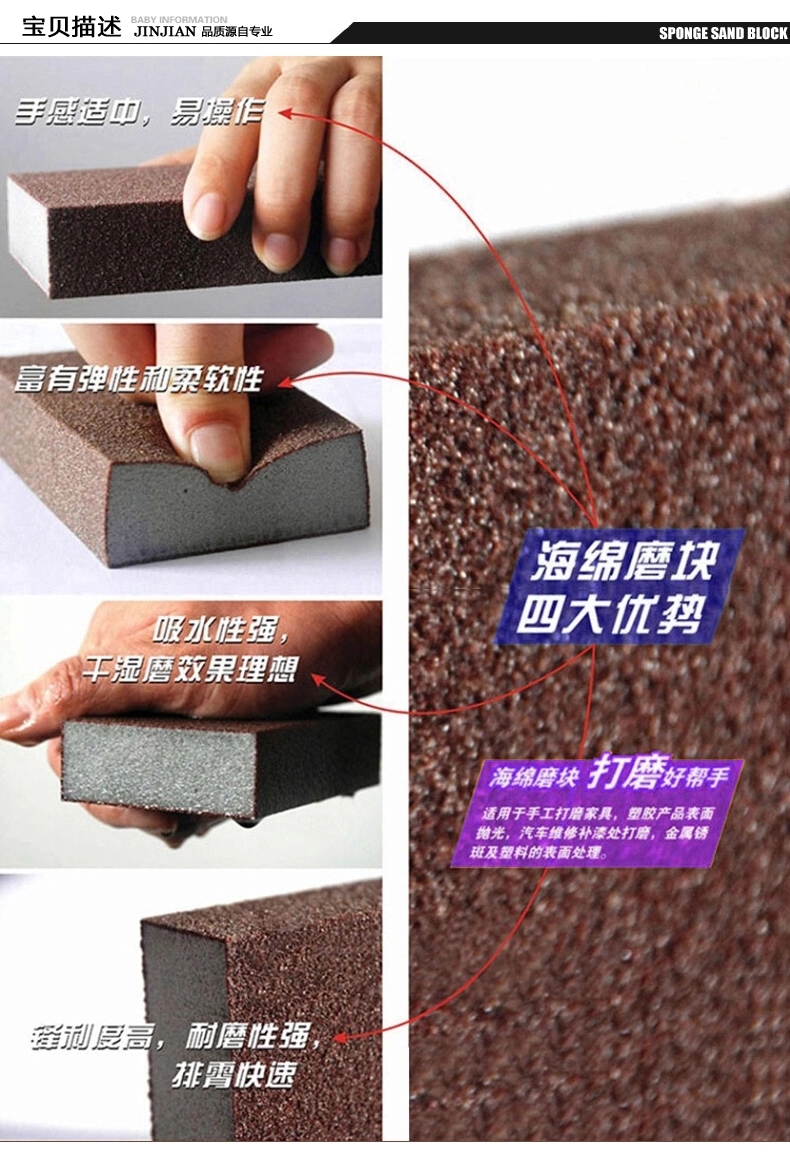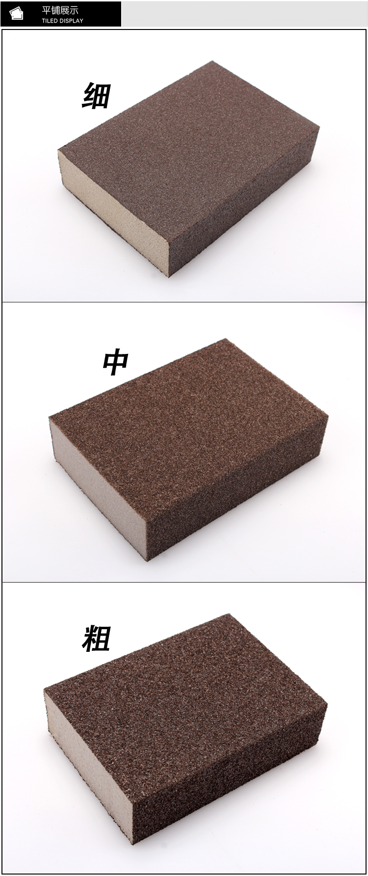 本品为原装高品质海棉砂,品牌,进口高质量砂布,不掉砂。可以反复使用相当于多张普通砂纸;里面是海棉结构,尤其适合打磨圆弧、弧状部位等,打磨时能很好地贴于圆弧面,能有效地避免普通砂纸打磨产生的不圆现象。