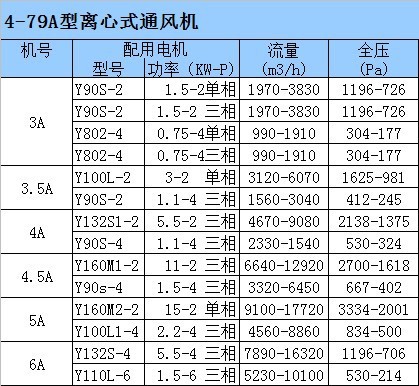 规格:每种风机机壳制成顺时针旋转和逆时针旋转两种型式。风机的出口位置,以机壳的出口角度表示。4-79型风机No3A~6A在出厂时均做成一种型式,使用单位根据要求再安装成所需要的位置,出风口位置调整范围0度~225度,间隔是45℃;No7C~8C出风口位置调整范围0度~180度,间隔22.5度;No10E~20E单进风和双进风出风口位置均制成固定大三种:0度、90度 180度