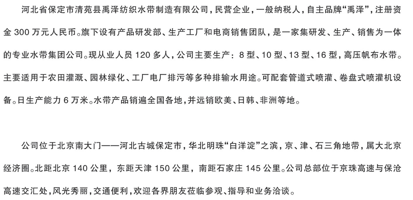 水带材质:由编织层和聚氨酯(涂塑)衬里组成