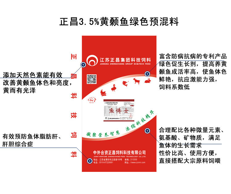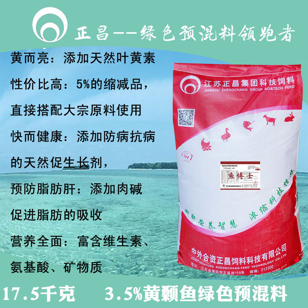正昌3.5%黄颡鱼绿色预混料是正昌鱼博士系列鱼类专用预混料产品之一,是运用世界先进的百瑞尔配方软件技术,针对黄颡鱼各生长阶段的不同特点而设计,本产品富含黄颡鱼生长所需的维生素、矿物质、氨基酸和中草药提取物等防病促长成分,能显著提高黄颡鱼的生长速度,成活率高,亩产增加显著,鱼体形正常,体色鲜亮,耐低氧、耐温性更强、耐长途运输。