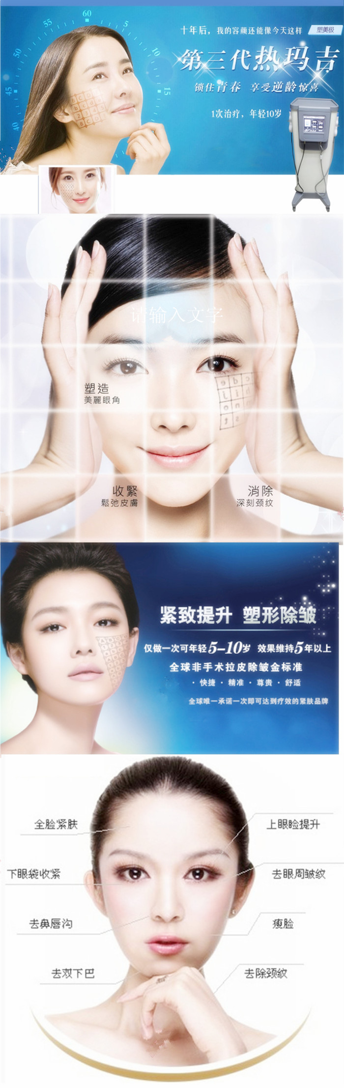 主要用于全面部皮肤组织松弛下垂、皱纹过多,肤质老化粗糙,重塑脸型曲线、有效提升眼周区及颈部组织松弛、下垂。