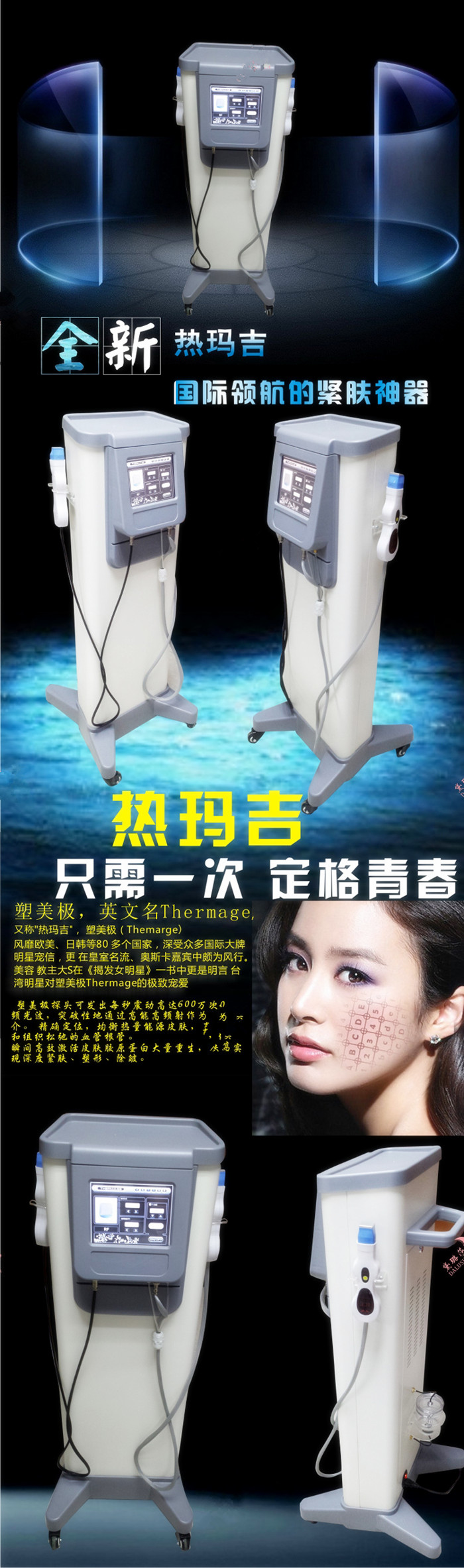 热玛吉又叫矩阵射频是一项能够通过一次治疗即达到显著提拉、紧肤、除皱效果,并可达到持续数年延缓衰老重返青春的神奇效果的美容术。热玛吉在全球率先采用于治疗前在治疗部位打格定位技术,是非手术整形全球顶尖科技的代表之一。风靡韩日、欧美等80多个国家,深受众多国际大牌明星宠信,在奥斯卡嘉宾、皇室名流中相当风行。在全球率先采用于治疗前在治疗部位打格定位技术,严格确保治疗后效果对称自然,安全可靠无损伤。是一种专业的非手术紧肤、除皱、塑形设备。该设备在全球率先采用于治疗前在治疗部位打格定位技术。是一种安全性高、不会造成伤口的治疗方式,已获医学临床证实能收紧与塑形皮肤。用于治疗前在治疗部位打格定位技术,严格确保治疗后效果对称自然,安全可靠无损伤。这项神奇的非侵入性组织紧缩和塑形先进美容技术,不手术、不注射、避免“切肤之痛”、高效安全、随做随走,过程轻松愉悦,术后无需特殊护理,不影响工作和生活。