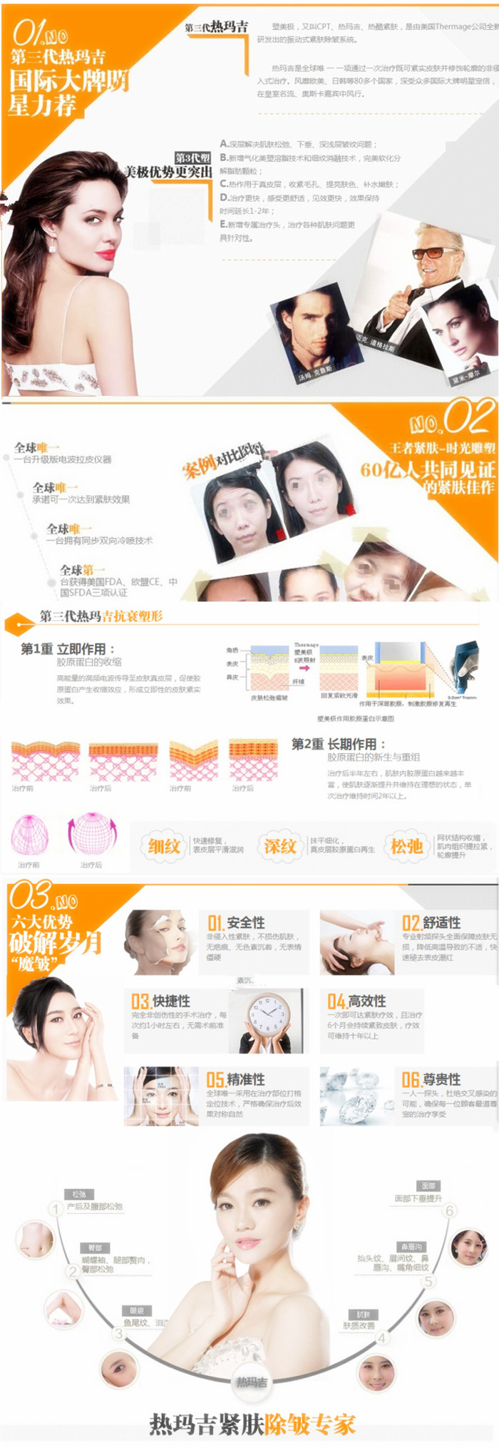 高频高能的能量传导一次治疗相比其他仪器的七、八次效果。实现肤质改善、面部提拉、眼部提拉等效果。