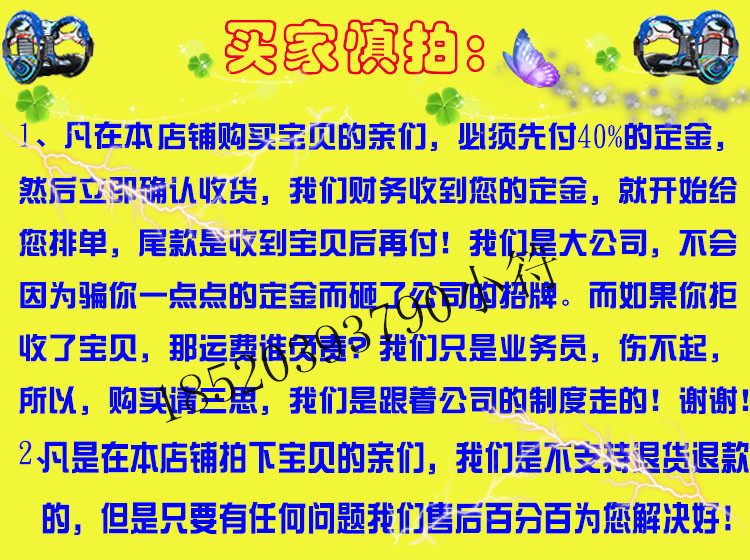 4、收费问题:买家应先拍下40%的定金,我厂即日给您排单(客户需求量大,供不应求)。物流到达您城市的物流点,你得检查物件有没有破损,如果有破损请立马打电话给客服。因为您的运费包括了保险,所以我们会追究物流的责任。验完货后你必须得付完尾款、淘宝确定收货还有付完运费才能给您提货。