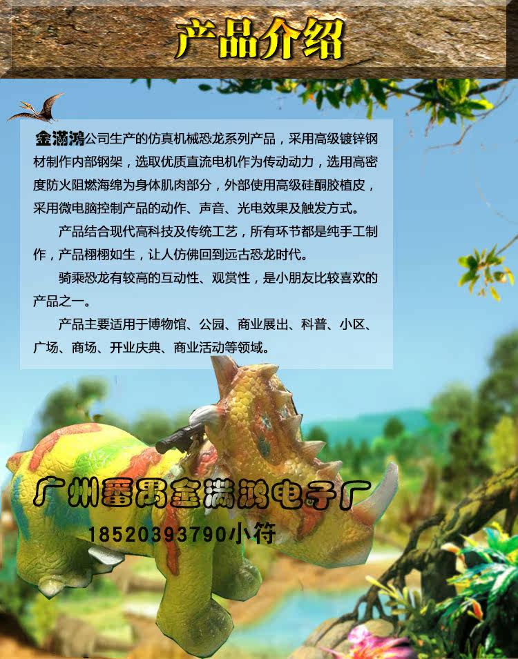 特点:仿真效果逼真,长期摆放,不掉色,不变型,软体具有弹力,电机恐龙有动作和声效