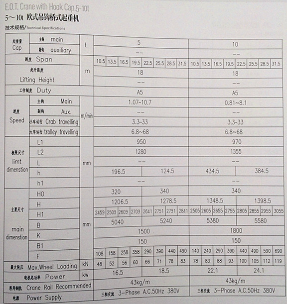 欧式单梁悬挂起重机的参数: