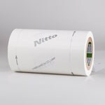 - 白色的聚乙烯薄膜上印有箭头、线条和 Nitto Denko 品牌名(灰色)