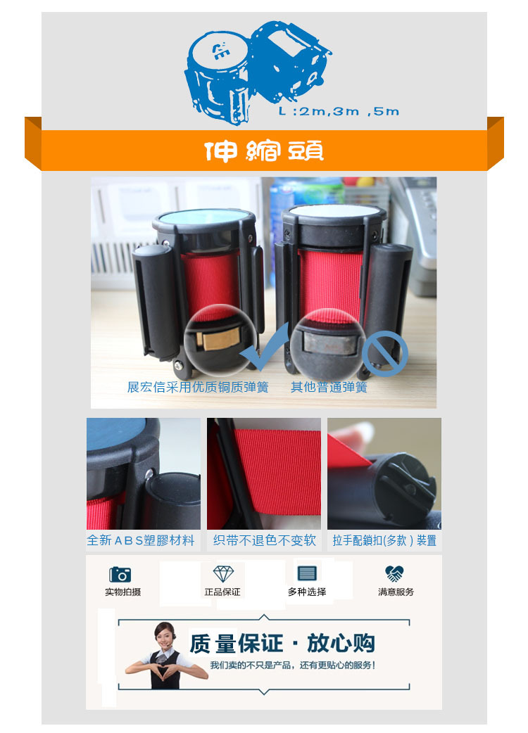 本公司生产的伸缩栏杆弹簧都全部德国进口,做工精美大方,是酒店、宾馆、会所、写字楼大厅、各营业大厅、车站、机场及各公共娱乐场所疏导及分流人流必备的大堂用品设施。