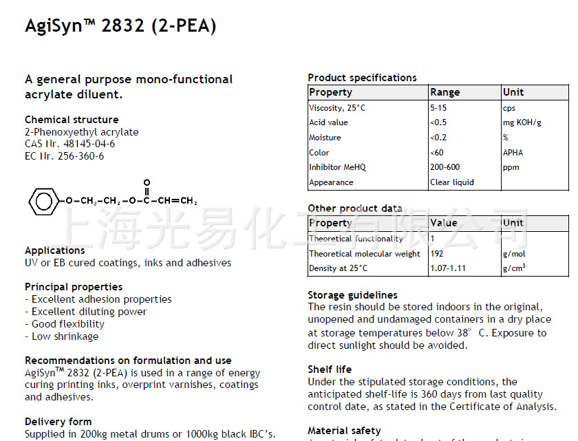 2-PEA是一种适用于光固化反应的丙烯酸酯类单体,可用于UV涂料、UV油墨、UV胶粘剂等各种不饱和体系的UV聚合反应。