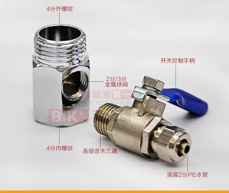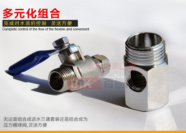 【持久耐用】采用铜质材料表面镀铬,持久耐用. 【灵活方便】可以多元化组合,无论是组合成进水三通套装还是组合成为压力桶球阀,灵活方便. 【适用范围广】通用所有的品牌,不同类型的净水器产品,也可通用其它类型对应口径产品 |