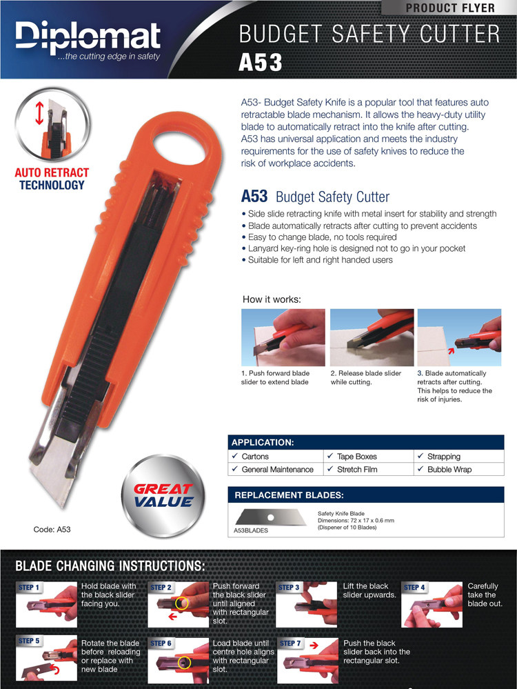 100%刀片自动回弹功能给予使用者全面保护,人机工程学两侧及顶部推动设计给予使用者更顺畅的工作。刀片一侧有刀片推动器,让使用者做拉后、横向及侧向切割。刀体为防滑塑料制造,适合右手操作者使用。可以更换刀片。