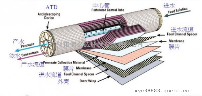 GE反渗透膜是对透过的物质具有选择性的薄膜称为半透膜,一般将只能透过溶剂而不能透过溶质的薄膜称之为理想半透膜。当把相同体积的稀溶液(例如淡水)和浓溶液(例如盐水)分别置于半透膜的两侧时,稀溶液中的溶剂将自然穿过半透膜而自发地向浓溶液一侧流动,这一现象称为渗透。当渗透达到平衡时,浓溶液侧的液面会比稀溶液的液面高出一定高度,即形成一个压差,此压差即为渗透压。渗透压的大小取决于溶液的固有性质,即与浓溶液的种类、浓度和温度有关而与半透膜的性质无关。若在浓溶液一侧施加一个大于渗透压的压力时,溶剂的流动方向将与原来的渗透方向相反,开始从浓溶液向稀溶液一侧流动,这一过程称为反渗透。