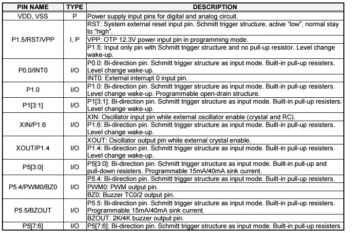 • 40mA高汲入电流GPIO pin:P5.0~P5.3, P5.5