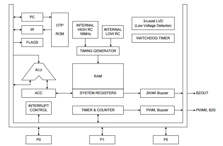 SN8P2602C的IC结构一流,包括大容量(1K-word)的程序内存(OTP ROM),48-byte的数据存储器(RAM)。1个8位基本定时器(T0+RTC),1个8位定时/计数器(TC0),1个看门狗定时器,3个中断源(T0, TC0, INT0),1信道可程序PWM,1信道2K/4K buzzer output (P5.5),40mA 高汲入电流GPIO pin (P5.0~P5.3, P5.5),4层堆栈缓存器。此外用户还可以自行选择振荡模式,SN8P2602C提供4种不同的振荡器模式给系统作为系统时钟,包括外部高/低速晶体振荡器、陶瓷谐振器、外部 RC振荡器作为系统时钟,一个内部16MHz RC振荡器和一个由程控的低速RC振荡器作为低速模式的时钟源。