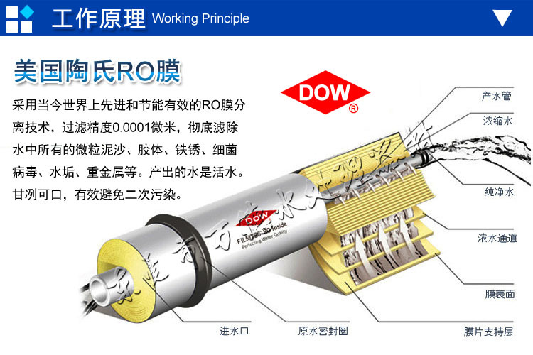 美国陶氏RO膜各型号脱盐率、产水量、操作压力及特点: