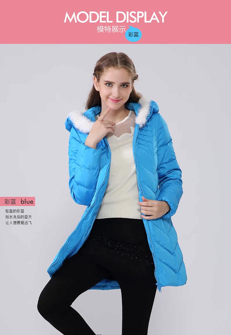 阿依莲2015冬季新款纯色经典连帽拼兔毛修身显瘦中长款