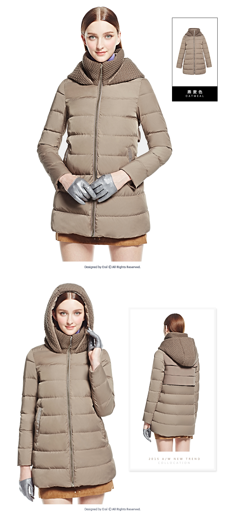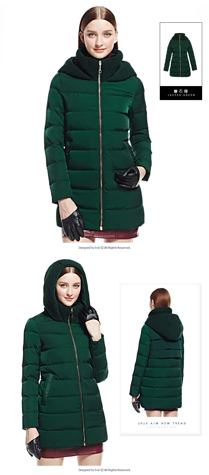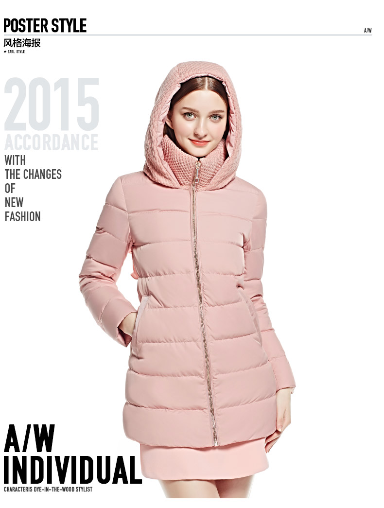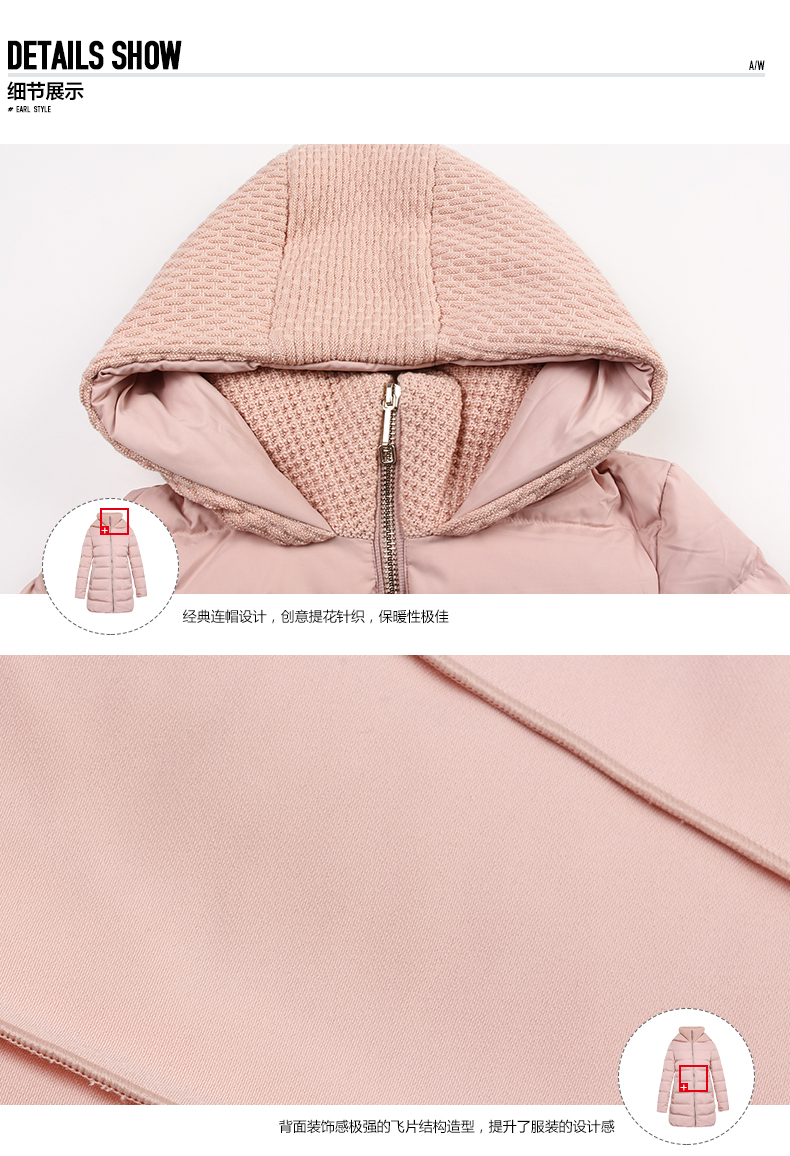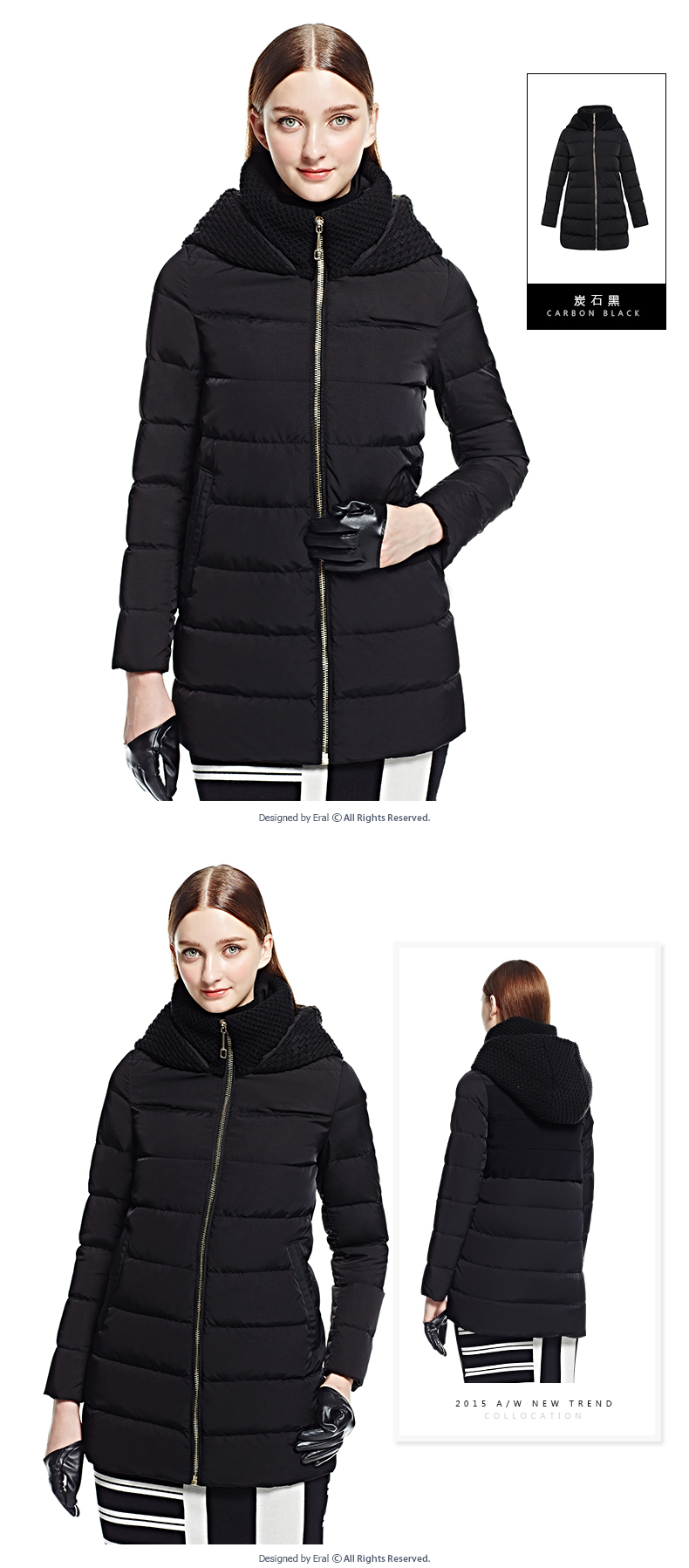 艾莱依2015冬新款针织拼接女中长款连帽修身纯色羽绒服ERAL6006D