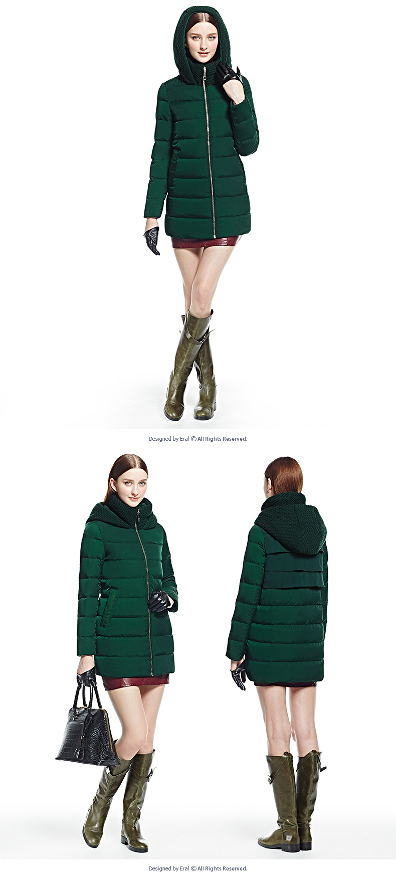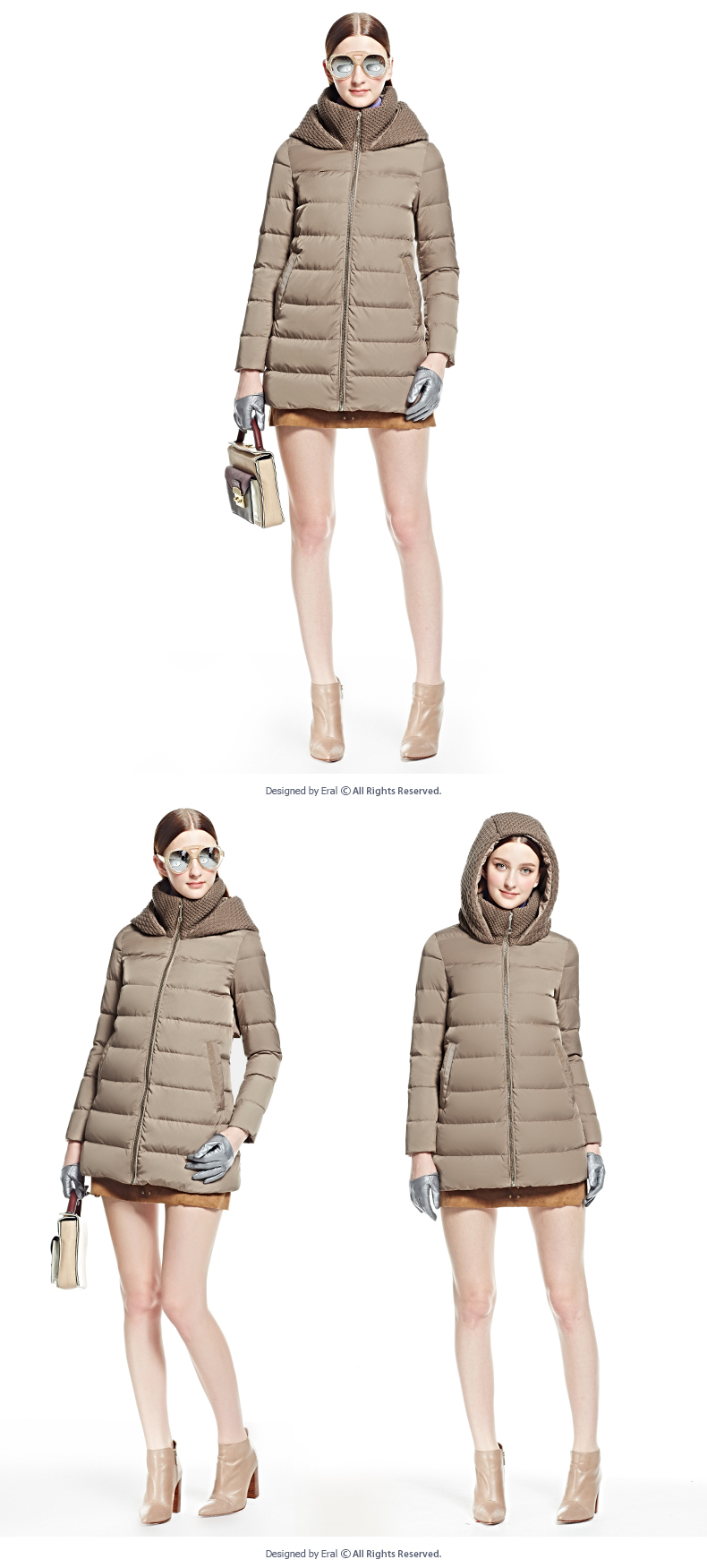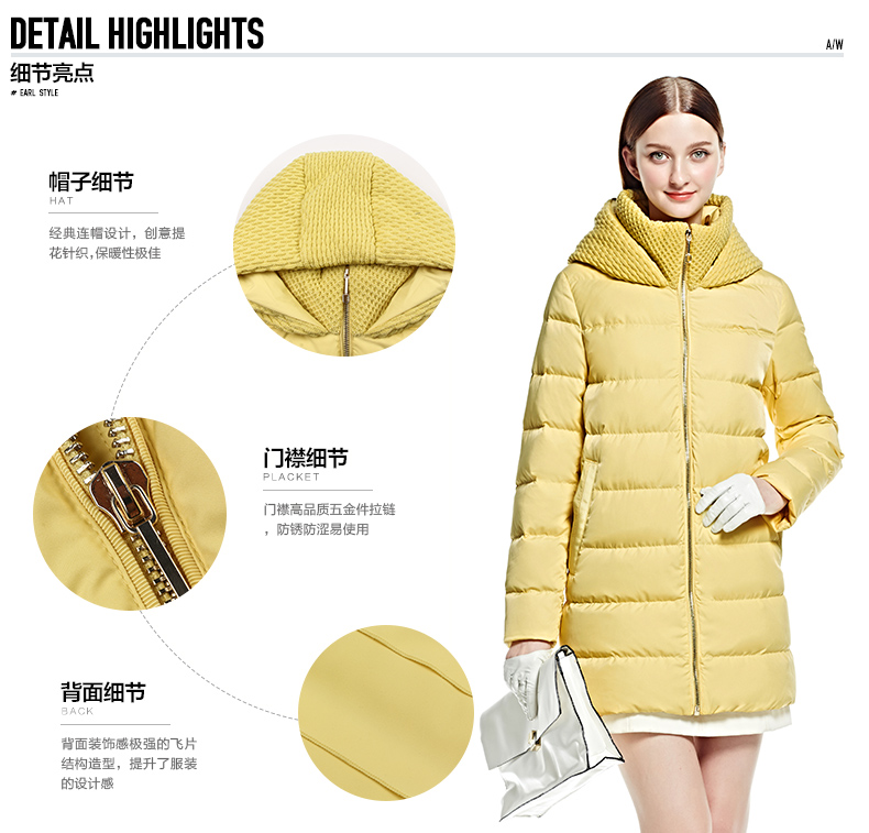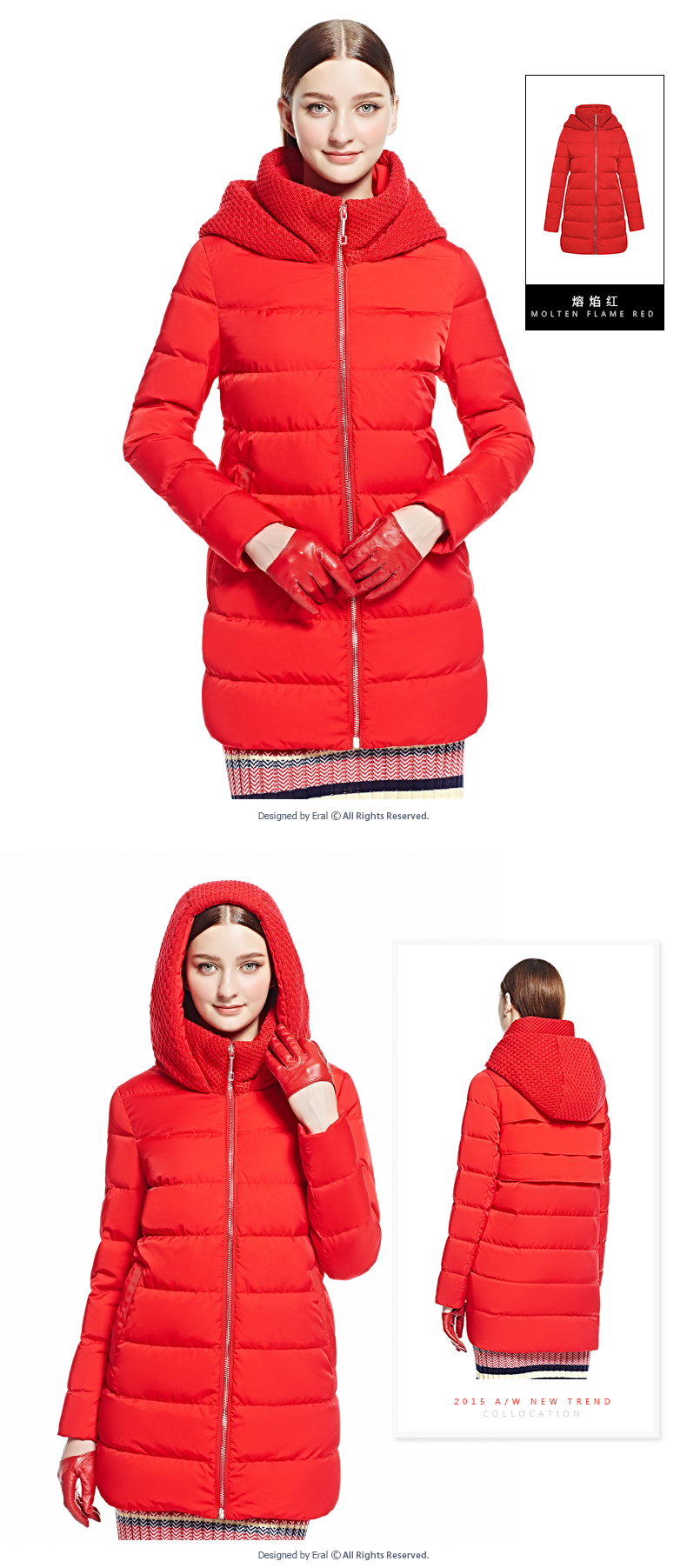 艾莱依2015冬新款针织拼接女中长款连帽修身纯色羽绒服ERAL6006D