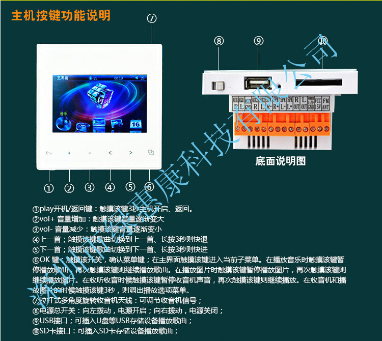 5、支持2路公共外接音源和5路本地音源(FM+SD卡+USB+蓝牙);