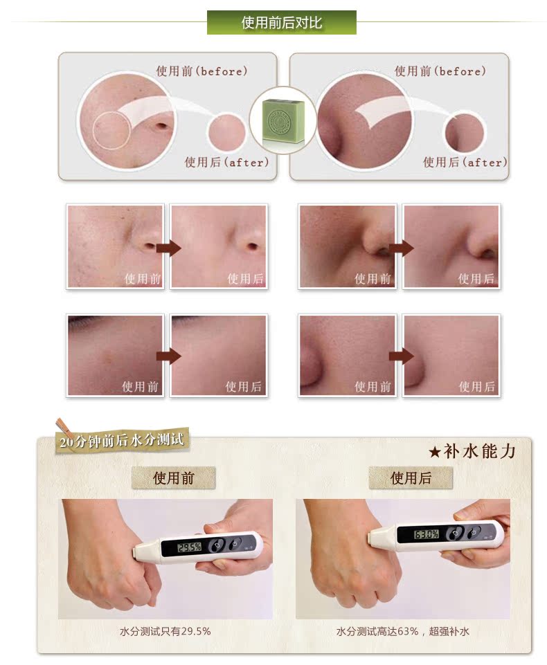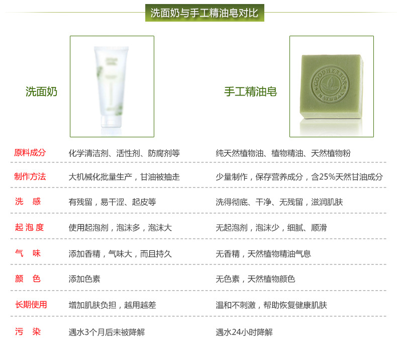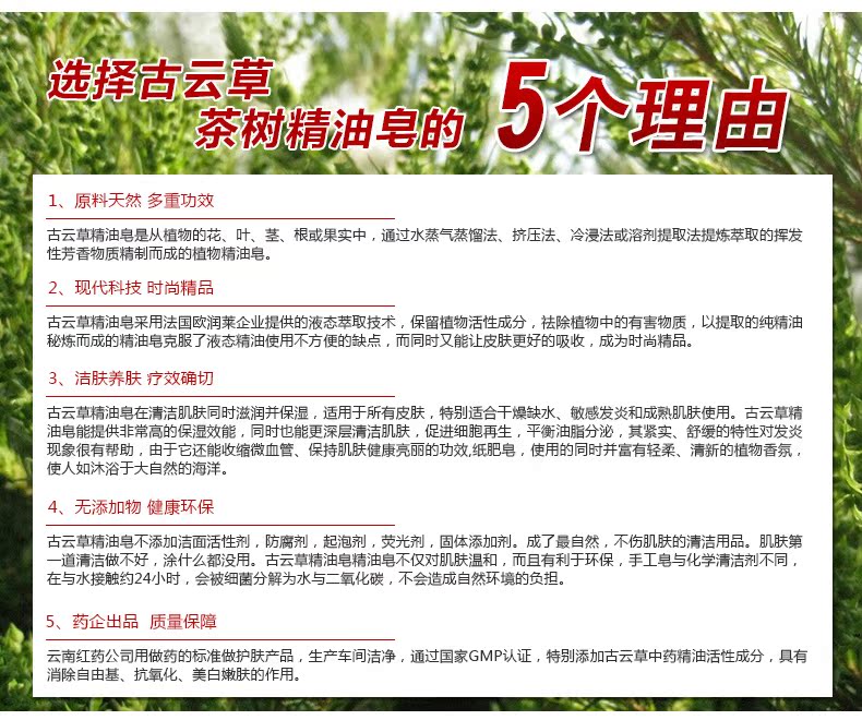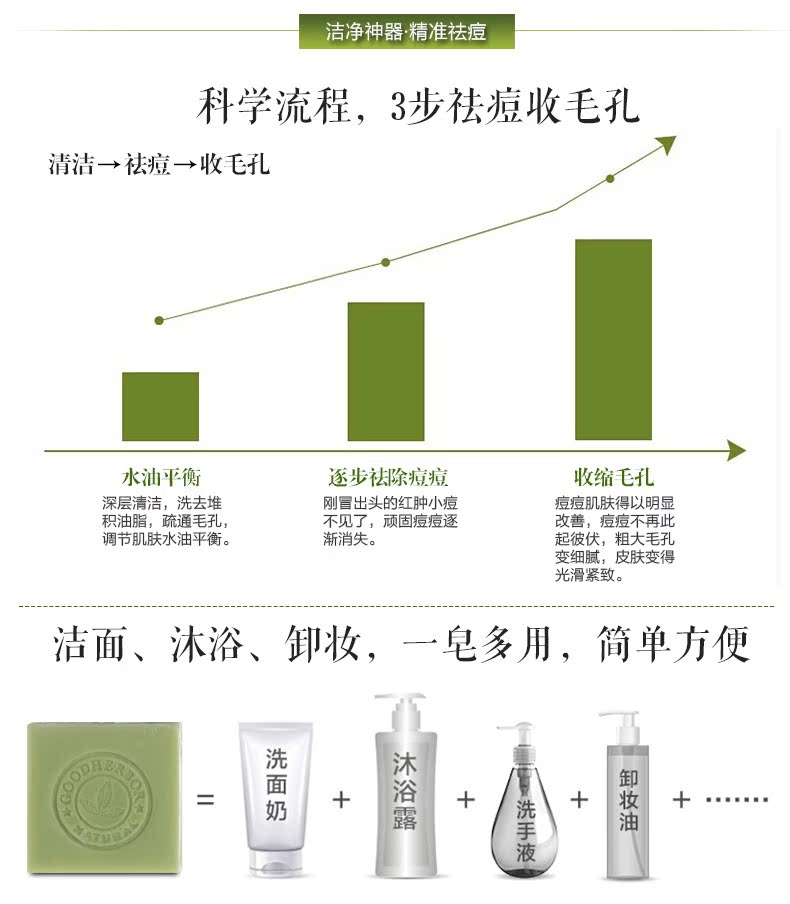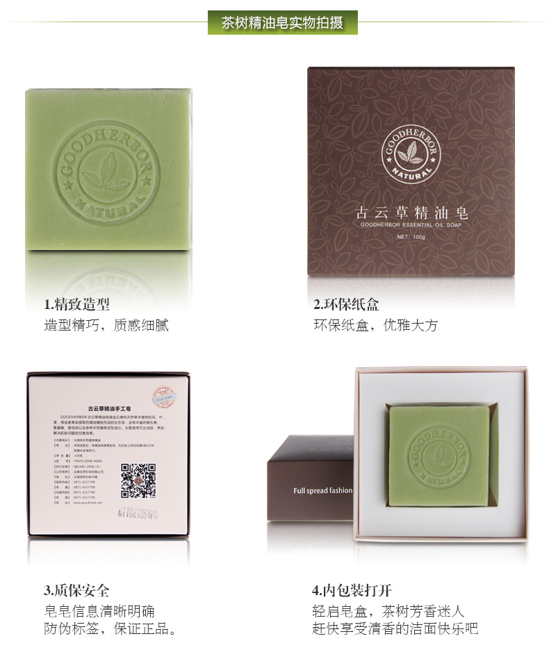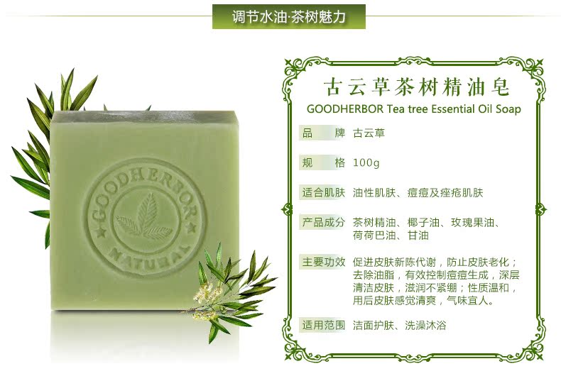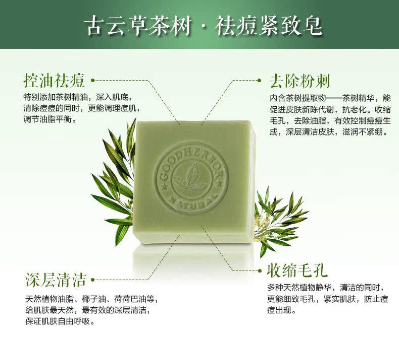 茶树皂提取自茶树精华,100%全天然植物配方,对皮肤无任何刺激!能够促进皮肤新陈代谢,防止皮肤老化。收缩毛孔,去除油脂,有效控制痘痘生成,深层清洁皮肤,产生丰富泡沫,温和去除肌肤油脂灰尘,轻轻松松把每个毛孔里的脏东西统统洗干净,让您的皮肤立刻补充鲜嫩的营养。滋润不紧绷。性质温和,用后皮肤感觉清爽,气味宜人。