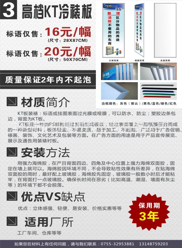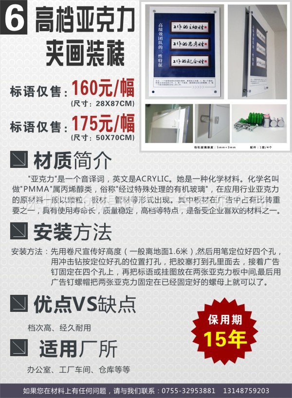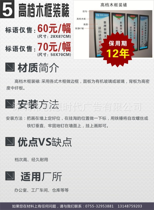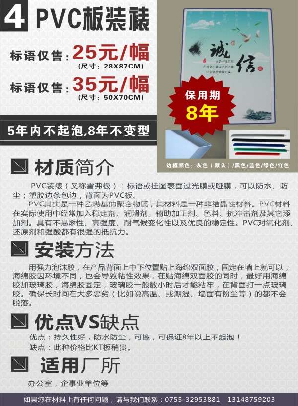 2,本套深圳龙华企业文化宣传海报可以做成多种材质,有单张背胶,泡沫板加塑胶边框,实质木框,铝合金框,双层进口高档有机玻璃等,我们根据客户要求打造出不同种类的产品图片,让客户满意。