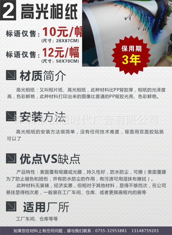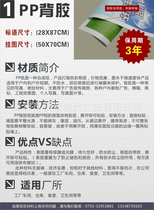 一口价是指单张背胶的价格,尺寸:50*70厘米。鼠标往下滚动可以查看深圳龙华企业文化宣传海报的全套系统的产品图片和各种材质的详细介绍。