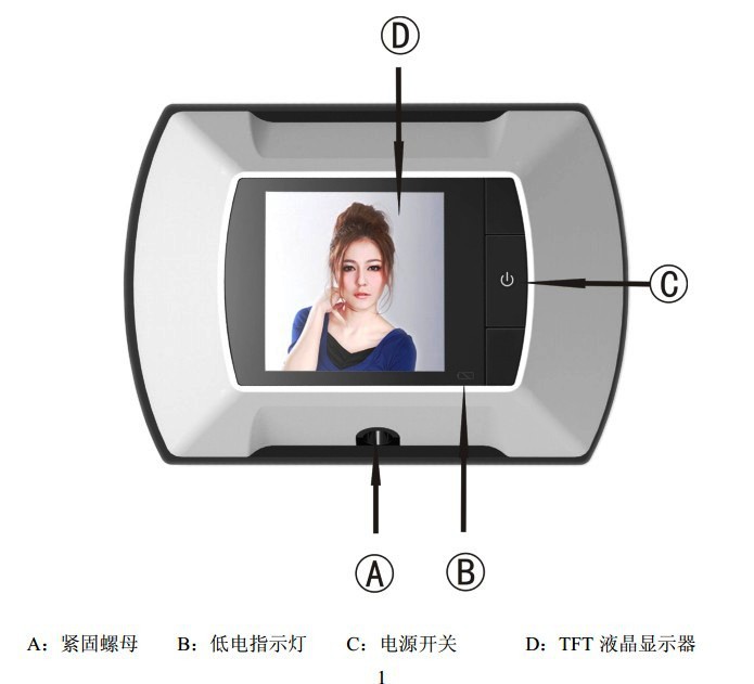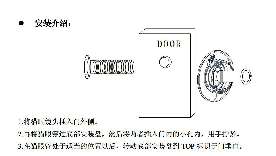 3.操作简单,一看就会,一用就灵。有人敲门,只需要轻按中间按键就显示门外来人。平时如觉门外有异常也只要轻按中间按键也可及时观查门外。