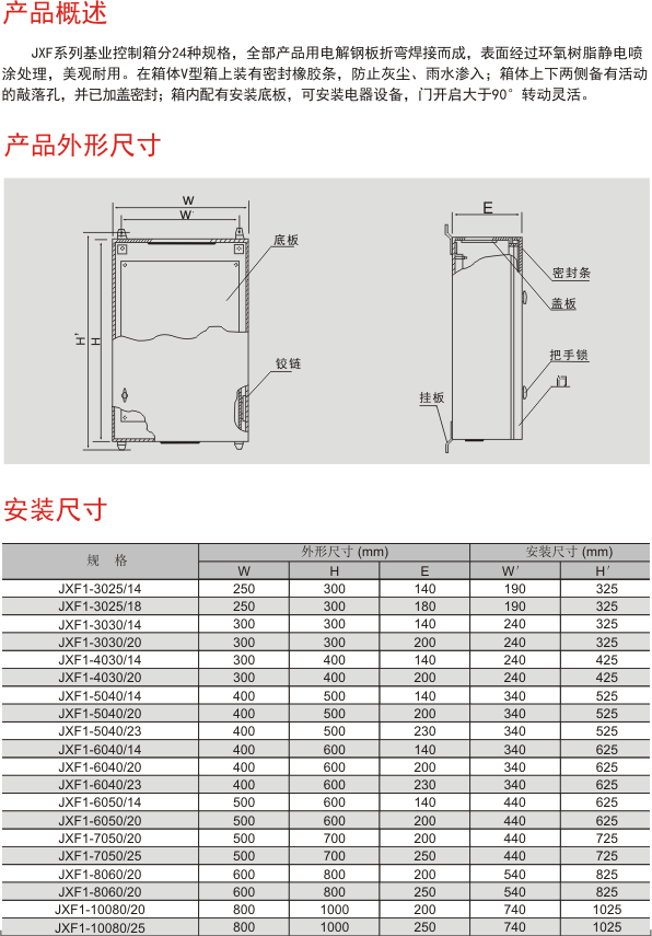 公司主营:不锈钢配电箱系列、动力配电箱系列、出口型JXF基业箱系列、照明配电箱系列、通信弱电箱系列、柜架成套系列及各种特殊要求的配电系列产品。并且通过了国家强制性认证。