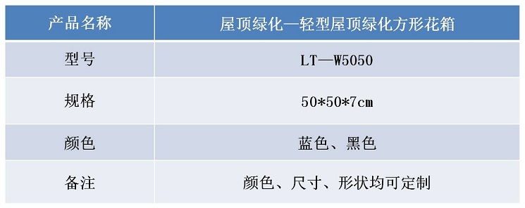 此产品主要用于轻型屋顶绿化,组合方便快捷,在短时间内可实现大面积屋顶绿化。产品针对佛甲草等景天科以及耐贫瘠的植物研发,使用时在花盆内铺一层无纺布,起到水分过滤作用,使得流出的水是清晰的。花箱四边相互扣连,底部有2cm支撑脚,一方面可以蓄水,一方面起到排水的作用。花箱与扇形部分组合可以形成多种图案。