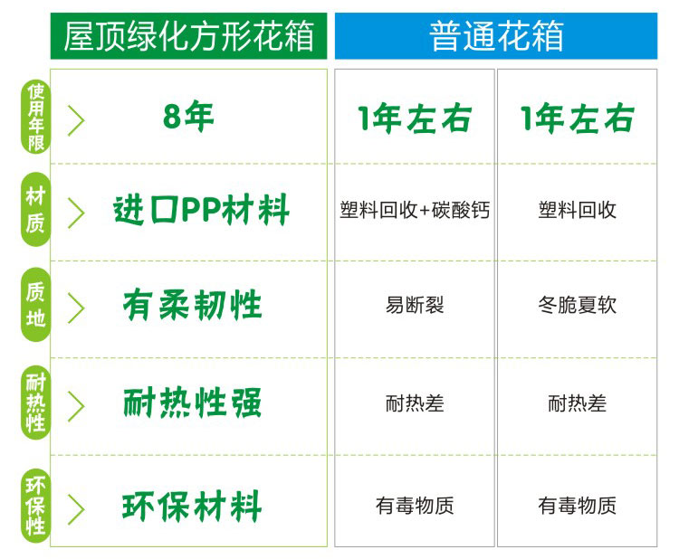 产品优势可以在地面种植好,搬上屋面就可以形成景观,一个花箱就解决了阻根、排水、蓄水、屋面对流等问题,同时又能适合植物生长需求。可移动便于屋顶检修,花箱之间相互连接,下部有对流层设计,既解决了屋面排水压力,又能满足屋顶安全需要。