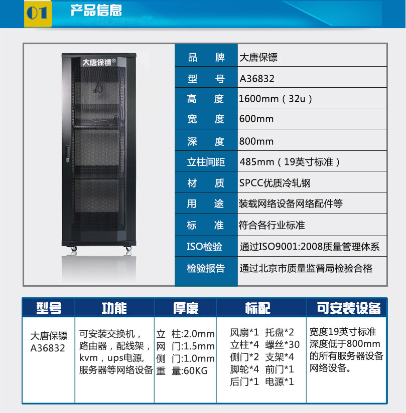 大唐保镖A36832 机柜 1.6米 服务器机柜32u 标准机柜