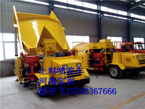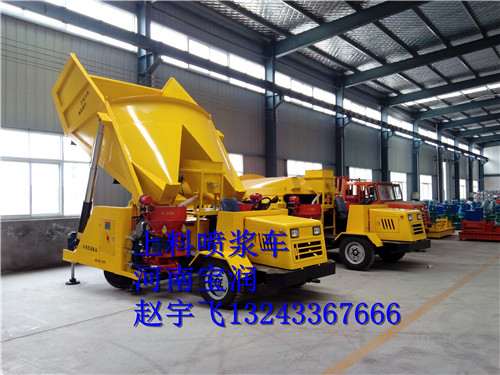 通过两个主油缸升降调节将混合好的料倒入喷浆机上料斗里,在倒入过程中再把上边的速凝剂斗下料口调节好,开动送料电机,从而实现按一定配比将速凝剂与混凝土在喷浆机经过振动筛网供入上料斗里二次搅拌。
