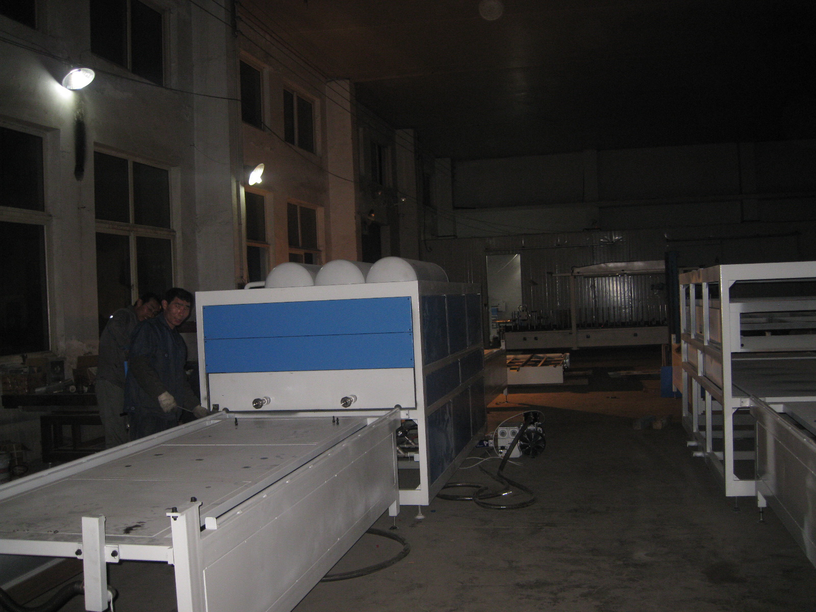 工作台尺寸 Working Table Size 极限真空度 Limit Vacuum Degree 实际耗电量 Actual Electricity Consumption 总功率 Total power 外形尺寸 Overall size 总重量 Total Weight | 2360*1120*60mm*2 -0.1Mpa 10kw 26kw 7480*1420*1400mm 2300kg |