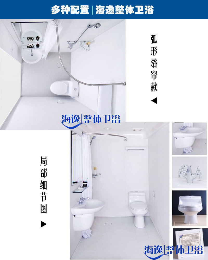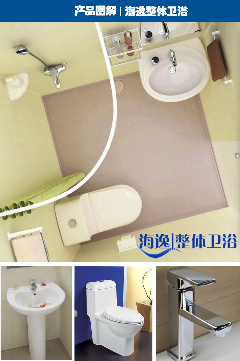 | 产品说明 | 1、规格参数 | 内部尺寸:宽1600mm×长1600mm×高2200mm 安装尺寸:宽1750mm×长1750mm×高2350mm 内部面积:2.56㎡ | | 2、主要配置 | 底盘:SMC模压成型或FRP 天花:SMC模压成型或FRP 墙板:SMC模压成型 洗面台:立柱,smc模压P型洗面台 连体超漩虹吸座便器 弧型浴帘 面盆龙头、淋浴龙头、浴巾架、毛巾架等标准配置。 |