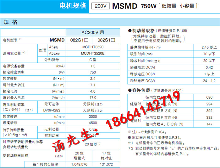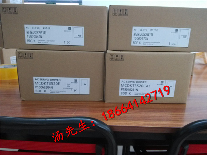 欢迎光临本店,本店特价供应产品:松下伺服、精密行星减速器、台达伺服、台达变频器、触摸屏、PLC、传感器等产品松下伺服电机750W脉冲不带刹车套装 东莞现货 伺服电机套装备注:松下伺服现已推出A5II,与A5使用无差异,具体型号信息请来电咨询:18664142719全新松下750W伺服电机套装 MSHMD082G1U+MCDKT3520E脉冲不带刹车,含插头一套, 额定转矩2.4N.M,瞬间最大转矩7.1N.M ,额定转速3000r/min,最高转速4500r/min.额定电流4(rms)瞬间最大电流17(A(0-p))80mm法兰安装,输出轴径19mm,伺服电机编码器为20位增量式旋转编码器,分辨率为131072。伺服驱动器工作电压为单/三相220V,脉冲+方向专控.本公司所售产品都为松下(Panasonic)厂家全新未拆封原装正品,全国质保一年。主营松下伺服电机/台达伺服电机, 备货充足,可当日发货。本公司还有配套的行星减速机销售,需要配伺服动力线和编码器线的请咨询旺旺或来电咨询。
