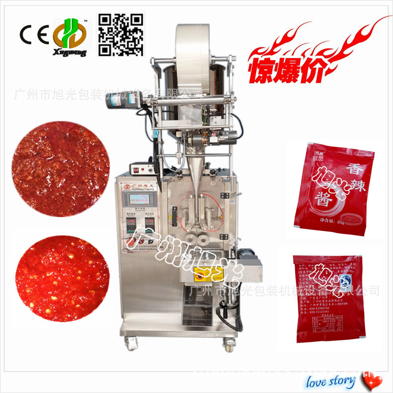 那么适合这种小型的袋装包装机,并且居家就可以使用的设备哪里有呢?广州旭光完全可以帮到您,新款小袋辣椒酱包装机,调味料包装机。
