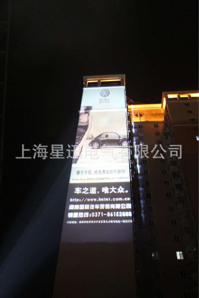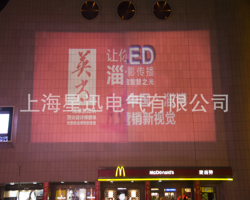 户外广告投影灯(PG灯)优势(1)极优的性价比传统的灯箱、广告牌只是一幅呆板的画面,日晒雨淋数月即残旧不堪,毫无美感;而PG投影灯神奇的光束可令画面长久艳丽,采用五画面转换功能更可在一处廉价的墙面或地面上投放多幅巨型广告图案,既鲜活动感又使利润倍增,轻松实现利润最大化的商业原则。(2)制作安装方便传统的灯箱安装起来既费时又费力,消耗不小的人力物力,又不能长时间的吸引住消费者的视线。动态投影广告将会帮助您省掉所有的不便,让您在短时间内完成以往烦琐的工作。(3)更换灵活便捷每一企业主都知道,传统的灯箱、广告牌更换起来非常的费事。一般广告一旦制作完成便很难修改。即使出现地址、电话号码更改这样小小的变动,整个广告也必须彻底推翻,重新制作,造成人财物力的巨大浪费。,而且往往不能很快的迎合瞬息万变市场,迅速的把企业的新观念、新产品表达给消费者。投影广告是利用一种大功率投影设备,运用光学投影原理,采用高亮度的光源,将底片上的全彩广告内容投射到高层建筑的外墙上,在夜间形成极富视觉冲击力的户外广告。其高到达率的特点,以及新颖特别的媒体形式、动态的视觉效果,能很好的吸引消费者的注意力。