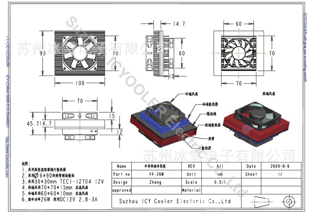 采用半导体电子致冷,体积小,重量轻Ø 没有压缩机,无氟利昂,环保,无振动,无泄漏Ø 采用环保材料,符合RoHS 要求Ø 安装方向无限制,可适用多种场合Ø 正常工作的环境温度为-10℃至+50℃Ø 密翅挤压型材散热器,散热性能良好Ø 高密度隔热泡绵,填充冷却器的热端和冷端Ø 热端散热器的过热保护器温度设定+75℃±5℃Ø 适用在密封、振动或转动等压缩机无法工作场合